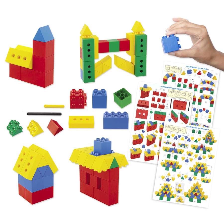 Набор конструктора включает 110 деталей ярких цветов, 10-и различных форм, в том числе параллелепипеды разных размеров, треугольные призмы, соединительные элементы в виде стержней.
